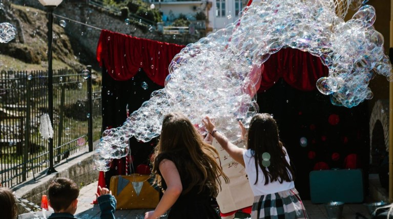 Στο βάθος του δρόμου ακούγεται ένα κουδούνι και μια γαργαλιστική φωνή. Όλοι στη γειτονιά βγαίνουν από τα σπίτια τους για να προλάβουν το ενθουσιώδες, φευγαλέο κάλεσμα. Πλανόδιοι καλλιτέχνες της Σαπουνόφουσκας, «οργώνουν» τις γειτονιές του κόσμου για να θυμίσουν ένα ξεχασμένο μυστικό: Το παιχνίδι στους Δρόμους! Λεωφόροι, οδοί, πλακόστρωτα στενά και πεζοδρόμια γεμίζουν αναρίθμητες φυσαλίδες, μικρών και απροσδόκητα μεγάλων διαστάσεων. Μια παρέλαση με ειδικά διαμορφωμένο τρίκυκλο ποδήλατο που κατακλύζει τους δρόμους με Μπουρμπουλήθρες και χαρμόσυνη ζωντανή μουσική.